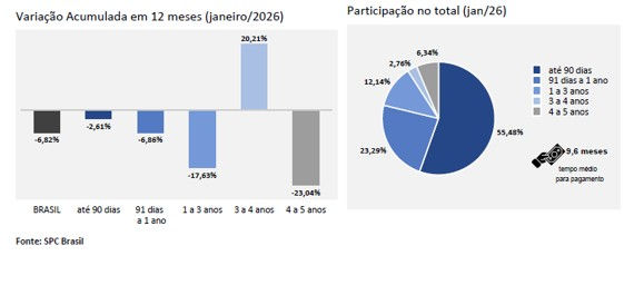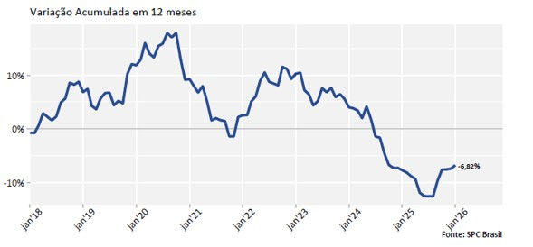 Paralelamente à alta reincidência, o Indicador de Recuperação de Crédito de Pessoas Físicas, que acompanha o número de consumidores que conseguiram sair dos cadastros de inadimplentes, registrou uma queda ainda mais acentuada. Nos 12 meses encerrados em janeiro de 2026, houve uma redução de ‐6,82% no número de consumidores que limparam o nome, em comparação com os 12 meses anteriores.